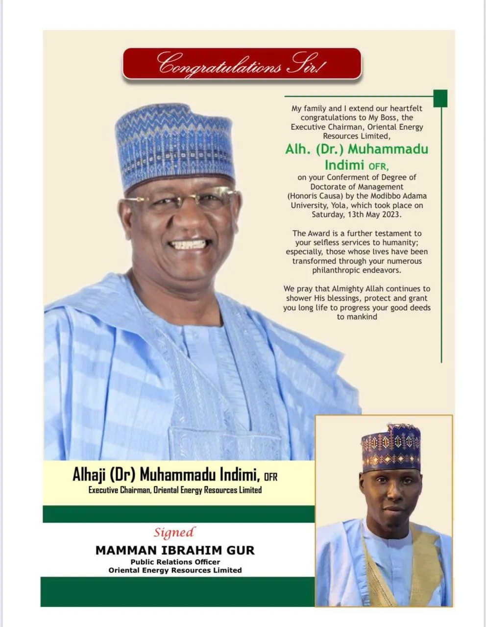 He said: My family and I extend our heartfelt congratulations to My Boss, the Executive Chairman, Oriental Energy Resources Limited, Alhaji Dr. Muhammadu Indimi OFR, on your conferment of Degree of Doctorate of Management (Honoris Causa) Modibbo Adama University, Yola, which took place on Saturday, 13th May, 2023.
